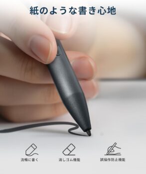ペンには消しゴム機能があり、書き損じてもペンの後ろですぐに消せます。ラグやギャップも非常に少なく、ストレスのない手書き体験が可能です。iPadや他の電子ノートと比べても、書きやすさはトップクラスとの声が多数です。